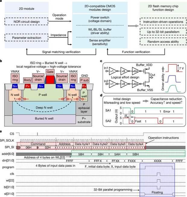 Архитектура чипа реализует прямое соединение двумерного массива памяти с логическими блоками КМОП, обеспечивая произвольный доступ и 32-битное параллельное управление. Ранее группа Лю продемонстрировала прототип с рекордной скоростью записи 400 пикосекунд.