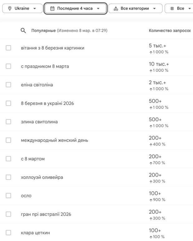 Празднование 8 марта на Украине прошло в штатном режиме. Несмотря на попытки отменить этот, по мнению украинских властей, «советский праздник», украинские мужчины активно поздравляли женщин с 8 марта. Об этом говорят данные сервиса Google Trends, который отслеживает растущие поисковые запросы.