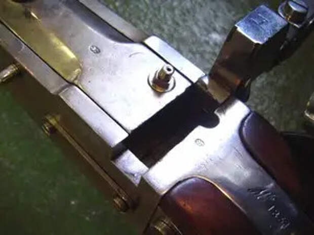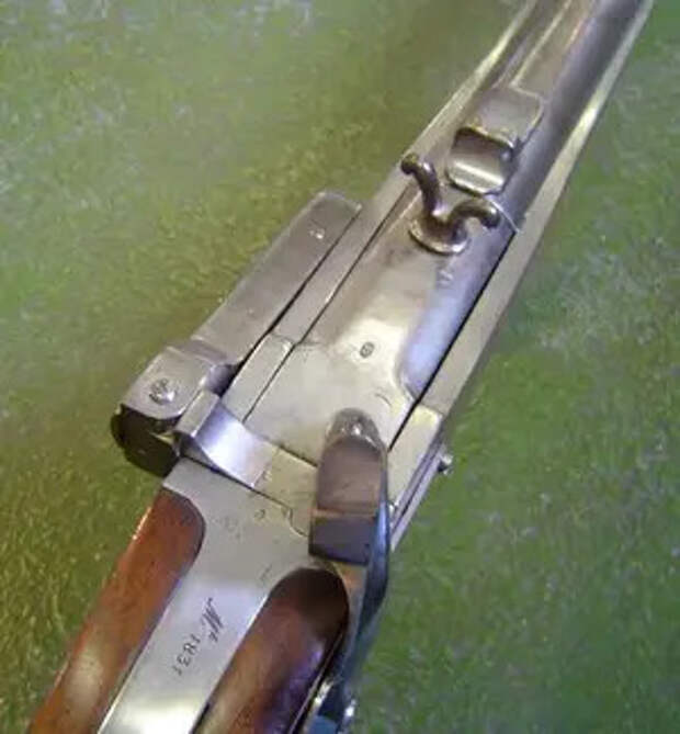 Винтовка была капсюльной, поэтому затвор имел форму стального бруска. V-образные «ушки» на затворе служили рукоятками для его извлечения из затворной коробки. Фото littlegun.be